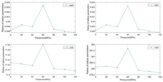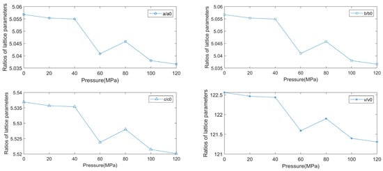Table 3 gives the relationship of changes of the lattice parameters of calcite crystals under different pressures. From the table, it can be seen that the lattice constant c shows a decreasing tendency with increasing pressure, while the lattice constants a and b tend to be basically stabilized. That is the change rule of the compressibility of calcite crystals. Among them, there is a difference in the variation trend of parameters b/a and c/a. The b/a tends to be stable, while c/a shows a decreasing trend with the increasing pressure. It shows that the calcite crystals have better compressibility in the c direction than in the other directions. The density of the crystals decreases and then increases as the pressure increases, and it changes after 80 MPa. To illustrate the rule of variation of the lattice constant under pressure, the lattice parameters and the ratio of volume change of the crystal lattice under pressure are shown (Figure 4). As we see from the graph, the ratios of the lattice constants decrease with the increasing pressure, peaking at 60 MPa. The overall change is not very obvious. It shows incompressibility between 0 MPa and 80 MPa.