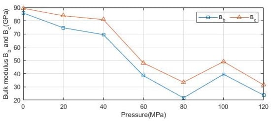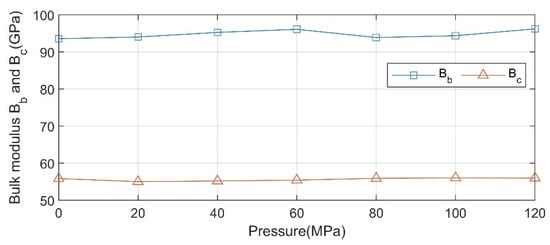 Similarly, the bulk moduli Bb and Bc of the quartz crystal in the b and c directions can be solved. Figure 9 shows the variation of the bulk modulus of the quartz crystal along the b and c directions with the pressure. As can be seen from the figure, Bb and Bc have the same trend with the pressure. The bulk modulus tends to decrease gradually with the increase of the pressure, and the bulk modulus tends to stabilize after 40 MPa.