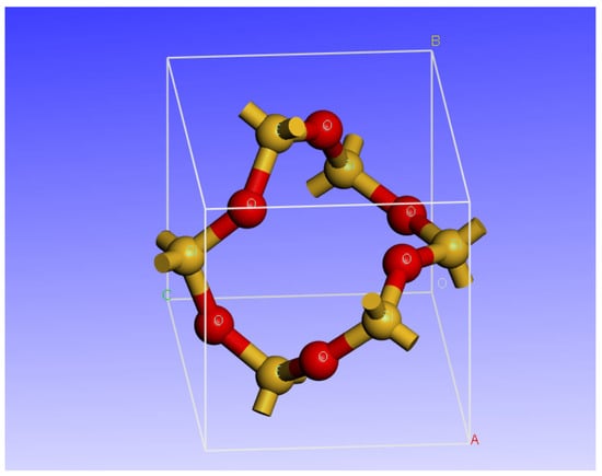 A three-dimensional spatial model of gypsum crystals is established by taking the independent crystals of gypsum as objects (Figure 1). Since gypsum crystals are orthorhombic, there are nine independent elastic constants in the elasticity tensor matrix. The deformation energy of the crystal was obtained by applying nine different strain modes to the crystal model. The elasticity tensor matrix of the crystal can be solved by means of a set of equations that relate the strain energy and strain of the nine modes. The first principles is used to determine the deformation energy of the crystal. Other parameters are determined according to the methods described in Section 2, such as the value of the Hamiltonian in a Schrödinger equation, the electron energy, the wave function of the electronic state, the convergence criterion in numerical calculation, etc.