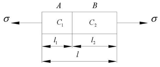 The elastic properties of a deep rock mass can be obtained by superimposing the elastic properties of each major component of the rock mass. To take one-dimensional uniaxial stretching as an example, as shown in Figure 11, the specimen consists of components A and B. The length of component A is l1, and the modulus of elasticity is C1. The amount of elongation is ∆l1 under the action of tensile stress σ. The length of component B is l2, and the modulus of elasticity is C2. The amount of elongation is ∆l2 under the action of tensile stress σ. The two components were separated by Hooke’s law as follows: