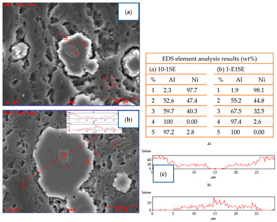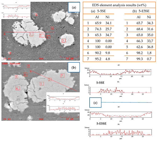 In Figure 3a,b, the EDS analysis results are given on the high-magnified SEM image of the 5-5SE and 5-E5SE samples, respectively. According to the results obtained from the light gray region number 2 in Figure 3a, it is understood that the Ni in region number 2 is less dissolved than in region number 3. Linear EDS analysis starts from the matrix and continues to collect all the NRR and then moves to the main matrix. On the SEM image, the darker colored region in NRR indicates more dissolution, while the light gray region indicates less dissolution. According to the EDS analyses taken from these points, the fact that Al is approximately 74% and Ni is 26% in the analysis of region number 2 is because the transformation is not completely completed. However, when the EDS region analysis number 3 on the SEM image is examined, the fact that Al has not reached approximately 65% and Ni has reached 36% indicates that the transformation has almost occurred.