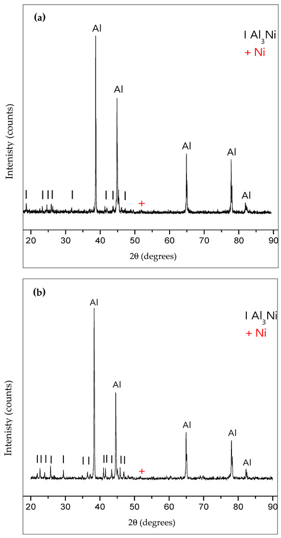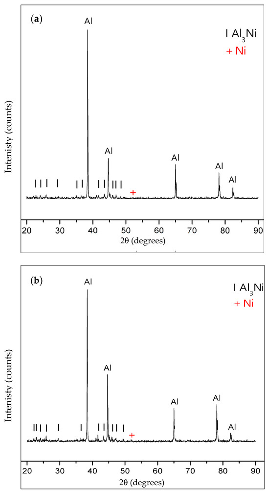 According to the XRD scanning results of the 5-5SE and 5-E5SE samples in Figure 10a,b, respectively, it is understood that Al3Ni peaks are formed in the samples. It is understood that the Al3Ni intensity in the 5-E5SE sample increases due to the increase in the ECAP pass number before sintering. Although the Ni content was low in these samples, the sintering temperature of 500 °C for 5 h was sufficient for the formation of Al3Ni. It does not fully show the SPD effect of the ECAP process.