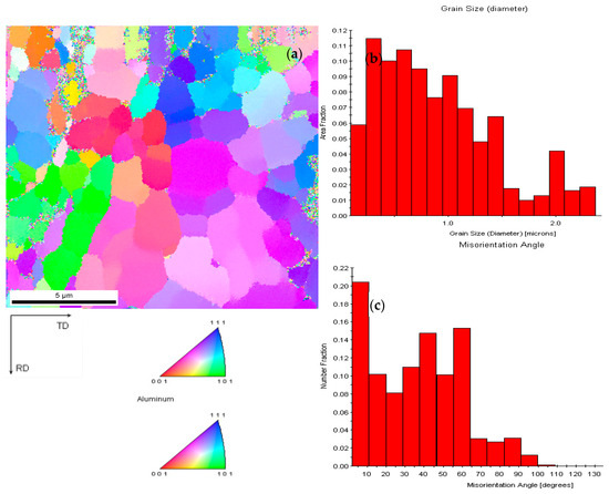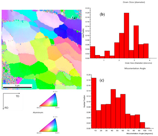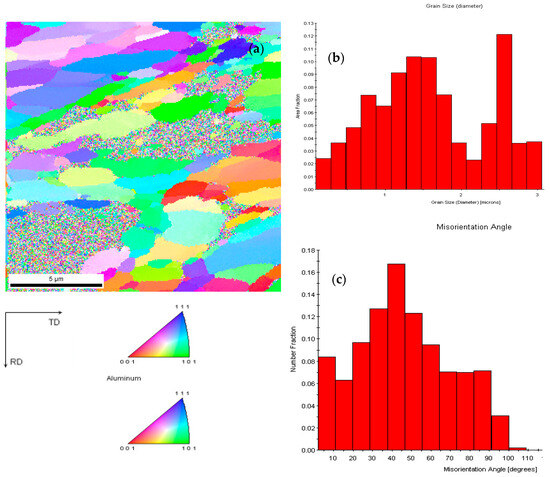 EBSD analysis results of the 5-5SE sample: (a) inverse pole figure, (b) grain size fractions, and (c) misorientation angle fractions.
