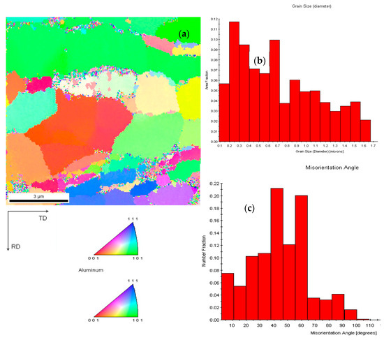 EBSD analysis results of 5-5SE, 5-E5SE, 10-1SE, 10-E1SE, and 10-5SE samples are given in Figure 11, Figure 12, Figure 13 and Figure 14, respectively. All figures show (a) the inverse pole figure image, (b) grain size, and (c) misorientation angles, respectively. According to the EBSD analysis of the 5-5SE sample in Figure 11, the average grain size was determined as 3.2 µm, and the average grain boundary angle was determined as 40.7°. The ratio of large-angle grain boundaries was calculated as 81%. EBSD analyses were taken from the longitudinal section of ECAP samples with severe plastic deformation, and it can be seen that the grain morphologies are equiaxial.