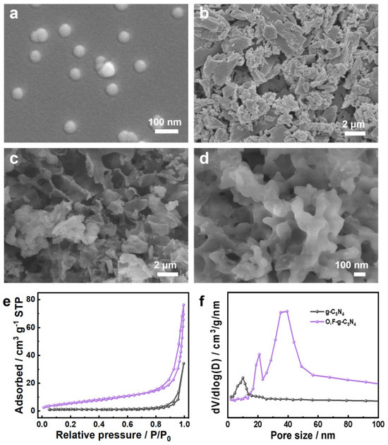 (a–d) SEM images of (a) colloidal SiO2, (b) pristine g-C3N4 and (c,d) O,F-g-C3N4 photocatalyst. (e) Nitrogen adsorption–desorption isotherms and (f) corresponding pore size distribution curves of g-C3N4 and O,F-g-C3N4 photocatalysts.