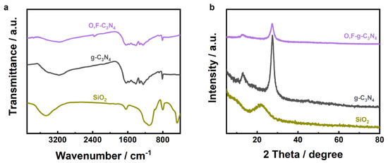 FTIR spectra and XRD patterns were employed to analyze the molecular and crystalline structures of colloidal SiO2, pristine g-C3N4 and O,F-g-C3N4 samples. As shown in Figure 2a, a broad absorption band at 1114 cm−1 corresponded to the characteristic Si-O-Si antisymmetric stretching vibration. Additionally, peaks at 471 cm−1 and 802 cm−1 were attributed to the Si-O bending vibration and the symmetric stretching vibration of the Si-O bond, respectively [25]. The peak at 807 cm−1 represented the typical characteristic absorption of the heptazine ring in g-C3N4, while a series of peaks within the range of 1200–1700 cm−1 were characteristic absorptions of CN heterocycles [31]. The O,F-g-C3N4 sample exhibited only the characteristic absorptions of g-C3N4, indicating that the fundamental heptazine framework remained intact.