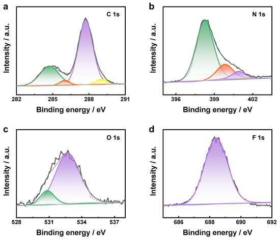 High-resolution XPS spectra of O,F-g-C3N4 sample: (a) C 1s, (b) N 1s, (c) O 1s and (d) F 1s.