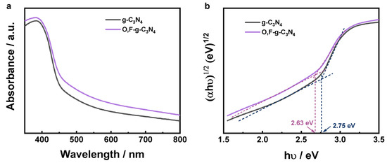 (a) UV-vis diffusion reflectance spectra and (b) Tauc plots of pristine g-C3N4 and O,F-g-C3N4 samples.
