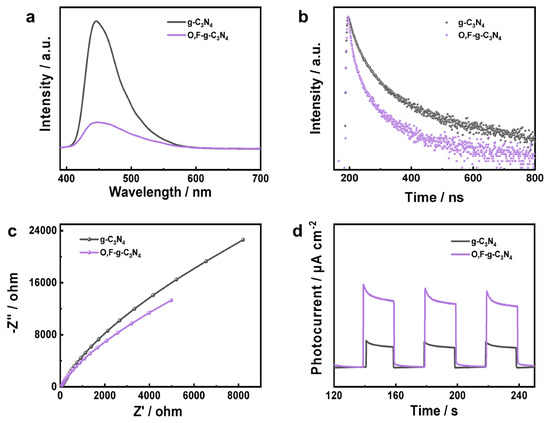 The photoelectric conversion efficiency of pristine g-C3N4 and O,F-g-C3N4 photocatalysts was evaluated using steady-state photoluminescence (PL) emission spectra, transient PL decay spectra, electrochemical impedance spectroscopy (EIS), and transient photocurrent responses (Figure 5). The effect of incorporated O and F on photoexcited charge carrier separation was assessed based on the peak intensity of the steady-state PL emission spectrum, where a lower PL intensity generally indicates the reduced recombination of photo-generated charge carriers [36]. As shown in Figure 5a, the O,F-g-C3N4 exhibited lower PL intensity compared to bare g-C3N4, indicating the promotion of the separation of photo-generated electron–hole pairs following O and F incorporation. The transient PL decay spectra further elucidated electron–hole pair dissociation kinetics [37]. Compared to pristine g-C3N4, the O,F-g-C3N4 photocatalyst exhibited a shorter exciton lifetime, suggesting faster dissociation dynamics of photoexcited charge carriers (Figure 5b).