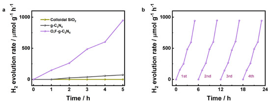 (a) The photocatalytic H2 evolution rates of the colloidal SiO2, pristine g-C3N4 and O,F-g-C3N4 samples. (b) The cyclic H2 evolution tests of the O,F-g-C3N4 photocatalyst.