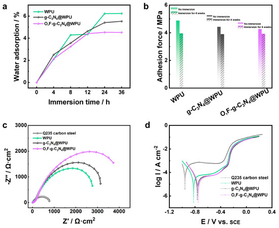 (a) Water absorption and (b) adhesion force of pure WPU, g-C3N4@WPU and O,F-g-C3N4@WPU coatings. (c) EIS spectra and (d) Tafel curves of Q235 carbon steel, pure WPU, g-C3N4@WPU and O,F-g-C3N4@WPU coatings in NaCl aqueous solution (3.5 wt.%).