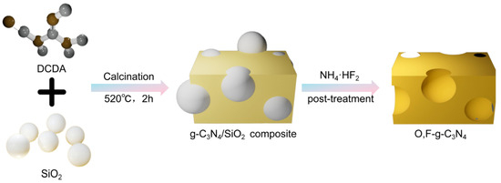 For the synthesis of the g-C3N4/SiO2 composite, a specified amount of colloidal SiO2, 1 g of DCDA, and 4 mL of H2O were mixed at room temperature under magnetic stirring for 2 h. The mixture was then transferred to a porcelain crucible and placed in a vacuum oven at 45 °C until completely dried. The resulting white powder was ground and subsequently calcined in a muffle furnace at 520 °C for 2 h with a heating rate of 10 °C·min−1. A heating rate of 10 °C·min−1 was selected to reduce the reaction preparation time. After natural cooling to room temperature, the light yellow powder was thoroughly ground in an agate mortar. This powder was then dispersed in 100 mL of a supersaturated NH4·HF2 solution and stirred for 24 h. The precipitate was washed with H2O until the pH of the supernatant was neutral. Finally, the resulting brown product was dried and donated as O,F-g-C3N4.