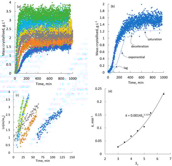 (a) plot of mass crystallised versus time (●: So = 3, ●: So = 3.5, ●: So = 4, ●: 4.5, ●: So = 5, ●: So = 5.5). (b) shows the different kinetic regimes involved in the crystallisation process (●: So = 3), (c) plot of ln (m/mo) versus t (●: So = 3, ●: So = 3.5, ●: So = 4, ●: 4.5, ●: So = 5, ●: So = 5.5), and (d) plot of the kinetic constant, k, versus initial supersaturation.