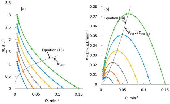 To derive Equation (12), we start by differentiating Equation (9) with respect to the dilution rate (D) and then set the result to zero, indicating that the productivity (P) is maximised at the optimal dilution rate (Dopt).
