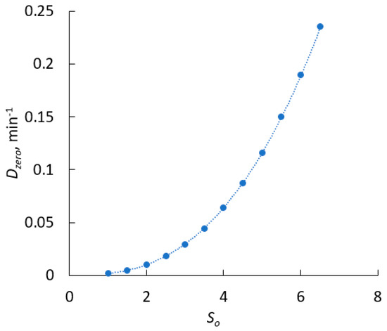 Equation (15) can be used to determine the dilution rate where we will observe either washout of crystals or no secondary nucleation. In Figure 3, we show the plot of So versus Dzero. Theoretically, the Dzero value increases with initial supersaturation following a power-law type expression, as in Equation (15). This trend is expected because a higher supersaturation implies a greater likelihood of secondary nucleation and growth, necessitating a higher dilution rate to attain washout conditions (assuming at higher supersaturations, secondary nucleation is likely to dominate, and Dzero can only be achieved via washout of the crystals dictated by the high dilution rate).
