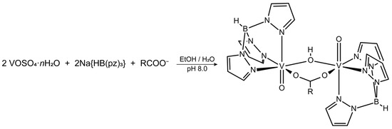 Reaction scheme for [(VO)2{HB(pz}3}2(μ-OH)(μ-O2CR)].