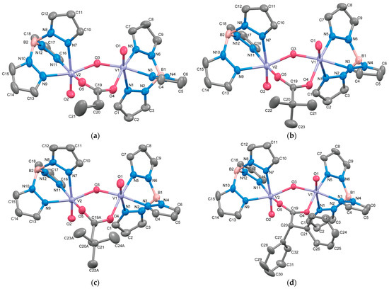 The bond distances and bond angles around V(IV) ions are consistent across all complexes, exhibiting no significant variations. The geometry around the vanadium ions (V1 and V2) is octahedral, with the axial axis aligned along the V=O direction. The V=O bond distances range from 1.581(2) to 1.596(2) Å, consistent with the typical V=O double bond length. The arrangements of the V=O groups in dinuclear oxidovanadium complexes can be classified based on their orientation relative to the V2O2 plane (orthogonal, coplanar, twist) and the alignment of the two V=O groups (syn, anti) [26]. Complexes 1–5 are classified as anti-orthogonal. The V–N bond distances for the pyrazolyl nitrogen atoms trans to the oxide ions (V1–N1 and V2–N7) are 2.2862(15)–2.322(3) Å, approximately 0.2 Å longer than other V–N distances (2.091(3)–2.1347(15) Å). This elongation is attributed to the strong trans-influence of the oxide ions. The equatorial coordination sites are occupied by the bridging hydroxo oxygen atom (O3), the bridging carboxylato oxygen atoms (O4 for V1 and O5 for V2), and two nitrogen atoms in pyrazolyl rings (N3 and N5 for V1, and N9 and N11 for V2). The vanadium ions are not located within the equatorial plane but are elevated by approximately 0.26 Å toward the oxo ion. In complexes 1–4, the difference in elevation between V1 and V2 is less than 0.01 Å, making them nearly identical. However, in Complex 5, V1 is elevated by 0.2601 Å and V2 by 0.2794 Å, showing a slight difference. The bridging O3 atoms are presumed to be hydroxo ions (OH−) rather than oxide ions (O2−), as the V1–O3 and V2–O3 bond distances (1.9750(15)–2.000(2) Å) are more than 0.1 Å longer than the typical V–O distance (~1.85 Å) in mixed-valence μ-oxo bridged dioxidovanadium(IV, V) complexes [40,41]. These findings confirm that these complexes are hydroxo-bridged dinuclear oxidovanadium(IV) complexes. The tridentate {HB(pz)3}− ligands show minimal distortion and effectively stabilize the dinuclear structures as terminal ligands. In complexes 1–3, which are bridged by aliphatic carboxylates, the terminal carbon atoms of the alkyl chains show significant displacement. Notably, in Complex 3, the t-butyl group is disordered in a 0.52:0.48 ratio.
