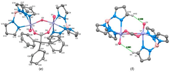 Intramolecular interactions are observed between the O1 and O2 atoms and the hydrogen atoms of the {HB(pz)3}− ligands. Figure 2f illustrates the intramolecular short contacts, O1···H10–C10 and O2···H1–C1, in 1, while the contact distances and angles for 1–5 are summarized in Table 5. The O1 and O2 atoms are each in close proximity to the hydrogen atoms at the 3 position of the pyrazolato rings located trans to one another, which are believed to contribute to the stabilization of the dinuclear structure. Since none of the complexes possess a centrosymmetric structure, differences of 0.2–0.3 Å in O···H distances and 5–10° in O···H–C angles are observed between V1 and V2.