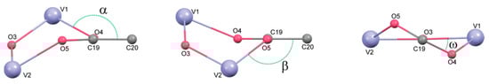The torsion angles (α and β) related to the coordinating carboxylato oxygen atoms and the twist angles (ω) for the V1···V2 and O4···O5 lines are summarized in Table 4 (definitions shown in Figure 3). The carboxylato bridging modes are classified based on these parameters [42]. For complexes 1–4, the absolute values of the α and β angles range from 140° to 156°, and the ω angles are approximately 30°, classifying these complexes as (skew–skew, non-planar) types. In contrast, for Complex 5, the α and β angles are 173.61(13)° and −175.14(13)°, respectively, with an ω angle of 0.60(8)°, indicative of a (syn–syn, coplanar) type. The syn–syn bridging observed in 5 is considered to result from steric repulsion caused by the bulky triphenyl group. In relation to the differences in bridging modes, the larger V1∙∙∙V2 distance and V1–O3–V2 angle in 5 compared to 1–4, as well as the difference in the elevation of V1 and V2 from the equatorial plane, expected that the magnetic properties of 5 may differ from those of the other complexes.