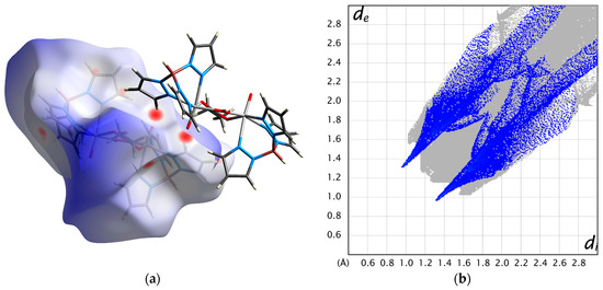 Additionally, intermolecular interactions are observed between the O1 and O2 atoms and the hydrogen atoms of the {HB(pz)3}− ligands in neighboring molecules. Hirshfeld surface analysis was performed for 1–5 using CrystalExplorer 3.1 [43]. The resulting Hirshfeld surface (dnorm) for 1 is shown in Figure 4a. The surface is mapped in red near the vanadyl oxygen atoms and the hydrogen atoms of the pyrazolato rings, highlighting the presence of strong interactions. The 2D fingerprint plots for O···H interactions are presented in Figure 4b (for 1) and Figure S6 (for 2–5). The fingerprint plots reveal two characteristic sharp spikes, indicating specific contacts between complex molecules, as seen in Figure 4a.
