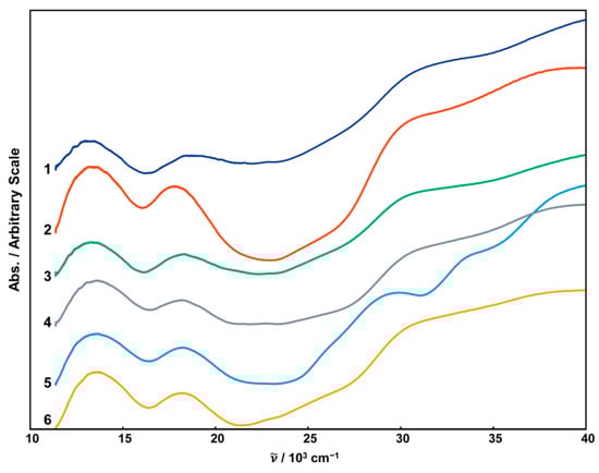 The electronic spectra of the present complexes were recorded using the diffuse reflectance technique. The spectra are shown in Figure 5, and the corresponding wavenumbers of the absorption bands are listed in Table 7. For all complexes, two absorption peaks and a shoulder attributed to d-d transitions were observed at approximately 13.6 × 103, 18.0 × 103, and around 30 × 103 cm−1. These transitions are assigned to the 2B2 → 2E, 2B2 → 2B1, and 2B2 → 2A1 transitions, respectively, originating from the tetragonally distorted oxidovanadium(IV) center [48]. Additionally, shoulder bands around 38 × 103 cm−1 were observed, which are attributed to metal-to-ligand charge transfer (MLCT) transitions involving the {HB(pz)3}− ligands [19]. The shoulder observed around 33 × 103 cm−1 in 5 is thought to result from the slight differences in the geometries of the two vanadium centers in this complex, as mentioned in Section 3.1. This geometric difference may cause the broad CT band originating from the {HB(pz)3}− ligands to split, making it distinguishable in 5.
