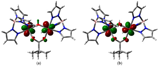 The singly occupied molecular orbitals (SOMOs) obtained from the Gaussian 16 calculations are illustrated in Figure 7. In the present complexes, the V···V distances are sufficiently large due to the presence of the μ-carboxylato bridge, preventing direct interactions. Furthermore, no superexchange pathways are observed in the asymmetric SOMO (ψas, Figure 7a). While a potential exchange pathway exists via the μ-hydroxo bridge in the symmetric SOMO (ψs, Figure 7b), the exchange interaction is considered weak. These quantum chemical calculations are consistent with the magnetic analysis results, indicating that complexes 1−6 exhibit ferromagnetic interactions (J ~ 20 cm−1) despite being classified as anti-orthogonal types.