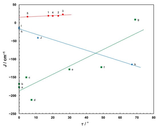 Magneto-structural correlations between the dihedral angles (τ) of the equatorial planes and the J values. Green squares represent Group A (monoatomic bridges), blue triangles represent Group B (diatomic brides), and red circles represent Group C (hetero bridges). Dotted lines in each color indicate the least squares fit for each group.