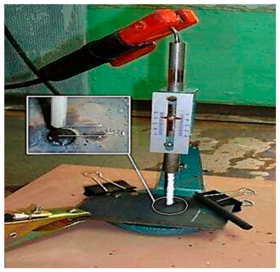 The tests were conducted under a 140 A alternating current. Figure 2 shows the setup of the experiment, which allowed measurement of the breaking length of the arc (“Lbla”), representing the length of the gap between the end of the electrode and the plate formed after surfacing.