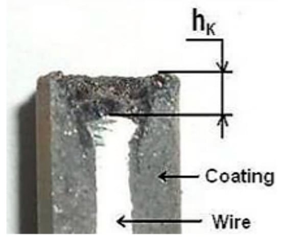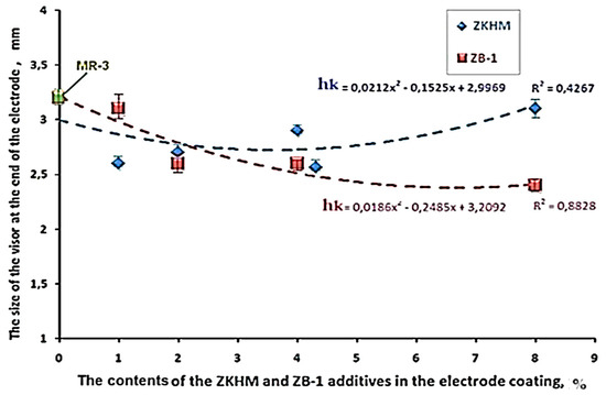 The values in the above table are the arithmetic means of three measurements. Interesting results were observed in a comparative analysis of the influence of PNFC additives obtained by various methods on the “hk” indicator. The effect of the PNFC additives on “hk” showed a robust correlation with the addition of the ZB-1 brand (R2 = 0.849) and a strong correlation with the addition of the additive ZKHM (R2 = 0.465). Despite this, the effect of the additives on this indicator differed depending on the brand of PNFC and the quantity of their coating composition. Thus, the addition of the PNFC additive ZKHM up to a concentration of 2% reduced the size of the visor, and a further increase increased this value (see Figure 5). The addition of ZB-1-brand PNFC to the coating reduced the “hk” indicator, and the higher its content in the electrode coating, the more effective it was. At the same time, “hk” decreased by 25% when the content of the additive ZB-1 was as high as 8%.