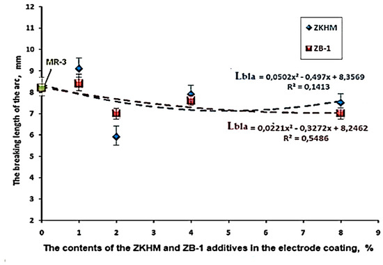 The dependence of the arc breaking length (“Lbla”) on the contents of the ZKHM and ZB-1 additives in the MR-3 electrode coating.