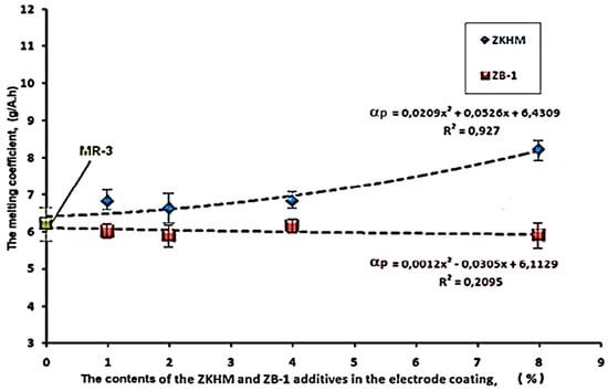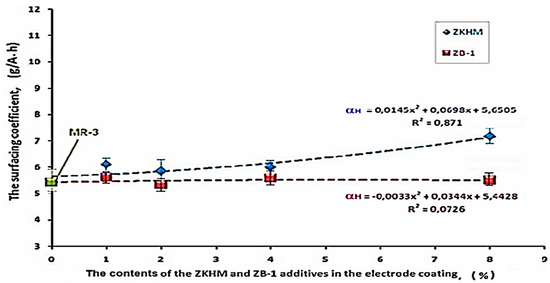 As shown in Figure 6, the influence of the ZKHM additive on the melting coefficient (“αp”) had a very strong correlation (R2 = 0.927), and this value increased throughout the entire studied range, as the maximum value was observed when the concentration of ZKHM was 8% (see Figure 6). On the contrary, welding electrodes with PFNC additives from the ZB-1 brand had a weak correlation with the melting coefficient (“αp”) (R2 = 0.209) and slightly reduced this indicator.