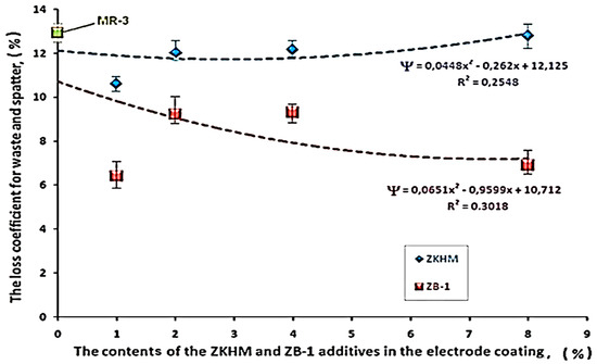 It is known that the moisture remaining in a coating deteriorates such welding and technological properties of welding electrodes as spattering and uneven melting [36]. In this regard, the effect of reducing losses due to waste and spattering when introducing PNFC can be explained by their ability to heat the coating during welding, which contributes to the efficient removal of residual moisture in the coating after the heat treatment of the welding electrodes.