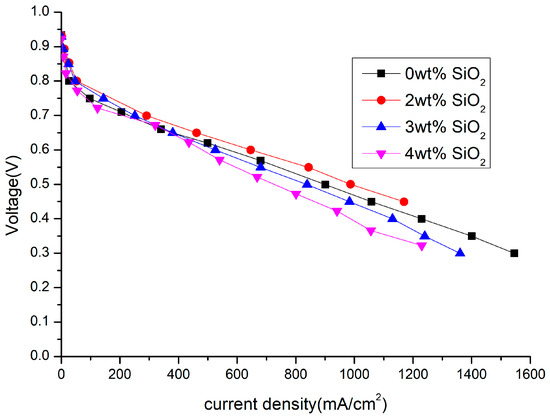 In the preliminary study, this paper explored the effect of different silica contents on fuel cell performance (Figure 1). If the silica content was too low, the water retention effect was insufficient. Increasing the silica content caused a certain degree of water flooding, leading to MEA expansion and catalyst delamination, which resulted in irreversible damage to the PEMFC to some extent. Therefore, 2 wt% silica was selected as the optimal solution in this study.