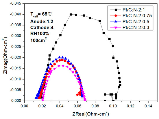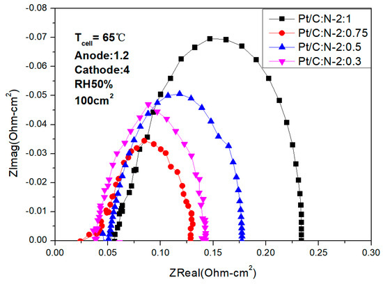 Figure 2 and Figure 3 are AC impedance curves at different humidity at 65 °C. From the two figures, it can be seen that the impedance under different Nafion weights is very different. When the amount of Nafion is too high, the impedance will be greatly increased, resulting in a decrease in performance, which is consistent with the results in preliminary experiment. When Pt/C:N-2:0.75, both ohmic impedance and polarization impedance are optimal values.