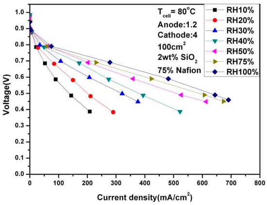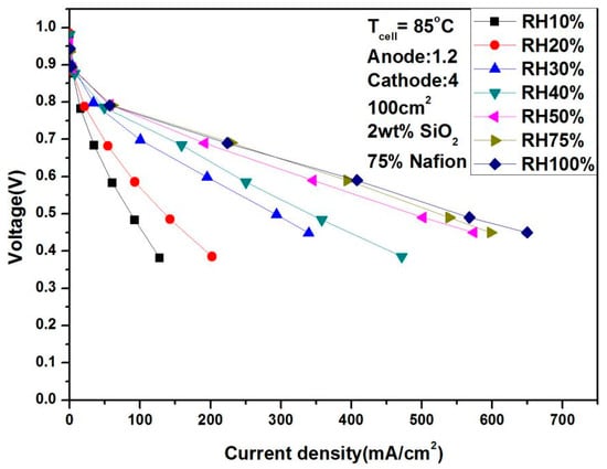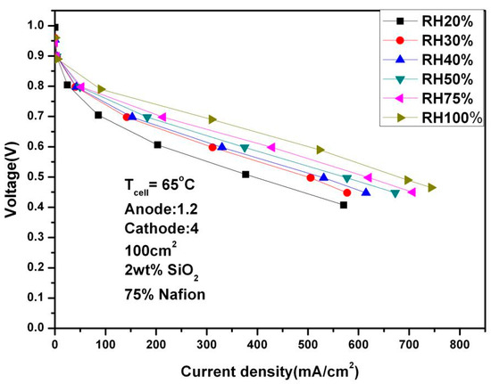 Polarization curves of PEMFC at 80 °C under various humidification.