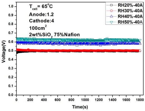 Polarization curves only reflect performance variations of PEMFC from one perspective. This study will further investigate voltage stability. A constant current method was employed, with the current fixed at 40 A under different temperatures, to study voltage variations in PEMFC. Preliminary research indicated that when humidity is above 50%, voltage changes are minimal. Therefore, to reduce the workload, this part of the study will focus on PEMFC operated at humidities below 50%.