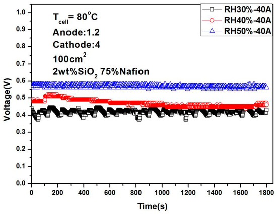 Figure 7 illustrates the voltage fluctuations of PEMFC at 65 °C as relative humidity decreases from 50% RH to 20% RH. The curve indicates that under a constant current of 40 A, the voltage fluctuation remains within the range of 0.01 to 0.03 V, with no significant deviations observed. On the other hand, as relative humidity decreases, the voltage value also gradually declines. This suggests that, despite the addition of hydrophilic materials, the cell performance still deteriorates with decreasing humidity at extremely low humidity levels.