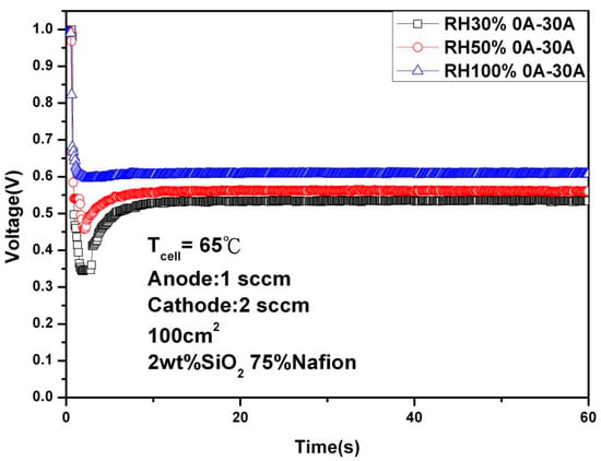 Transient Startup Curves under Constant Current (0 A–30 A) at 65 °C and Various Humidity.