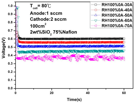 3.2.2. Voltage Variations of PEMFC Under Constant Current at 80 °C