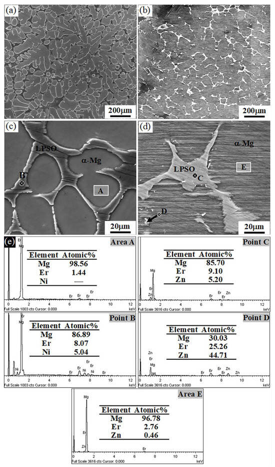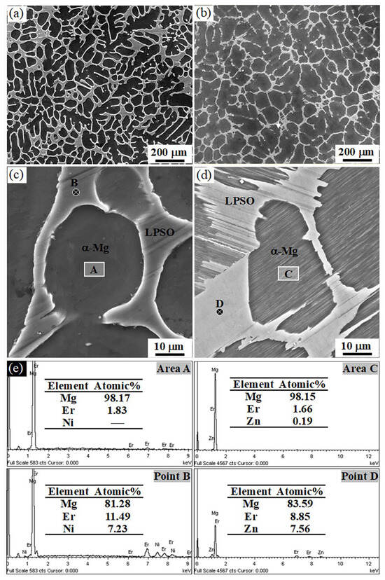 SEM images of the as-cast alloys: (a,c) Mg97Er2Ni1 and (b,d) Mg97Er2Zn1, along with (e) the corresponding EDS results.