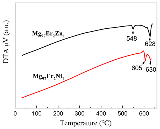 The thermal behaviors of as-cast Mg97Er2Ni1 and Mg97Er2Zn1 alloys were investigated using differential thermal analysis (DTA), as shown in Figure 3. Both alloys exhibit two endothermic peaks. According to our previous study [10], the first peak corresponds to the melting of the LPSO phase, and the second one means the melting of the α-Mg phase. It is noted that the melting temperature of the LPSO phase in the Mg97Er2Ni1 alloy is as high as 605 °C, which is 57 °C higher than that of the LPSO phase in the Mg97Er2Zn1 alloy. This represents the highest melting temperature for an LPSO phase reported to date, significantly exceeding 528 °C for the LPSO phase in a Mg-Gd-Zn alloy [34], 550 °C for the LPSO phase in Mg-Y-Zn alloys [41], and 540 °C for the LPSO phase in Mg-Gd-Ni alloys [10].