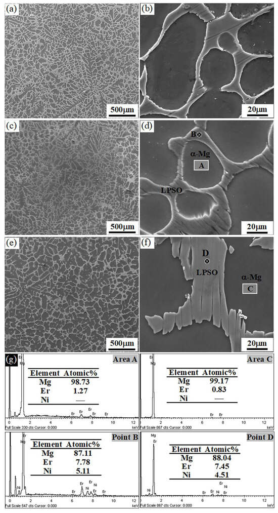 SEM images of Mg97Er2Ni1 alloys: (a,b) in the as-cast condition, (c,d) after heat treatment at 500 °C for 100 h, and (e,f) after heat treatment at 540 °C for 100 h. The corresponding EDS results for the heat-treated alloys are presented in (g).