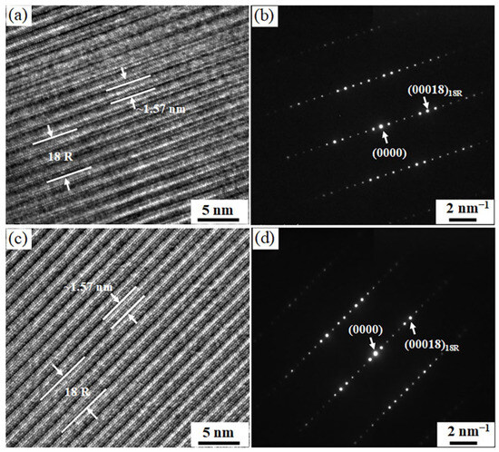 High-resolution TEM image and corresponding SAED pattern of the LPSO phase in the Mg97Er2Ni1 alloys: (a,b) as-cast; (c,d) heat-treated alloys at 540 °C for 100 h. The electron beam is parallel to [110] of the α-Mg.