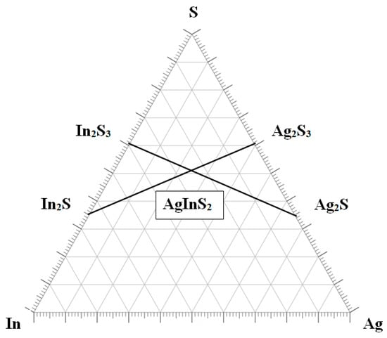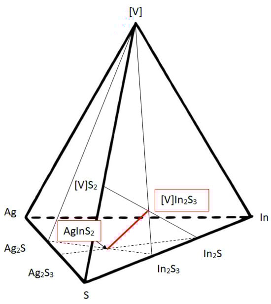 On the lower face there is a point satisfying conditions “4” and “8”; this is AgInS2 and there is no element [V] on it. To satisfy Goryunova’s condition (Figure 1), it is necessary to consider the lateral face. This condition corresponds to the completeness of the connections in the presence of a crystal-forming zero element—an In2S3 vacancy. Therefore, the solution that satisfies conditions «4» and «8» will lie on the line connecting these points.