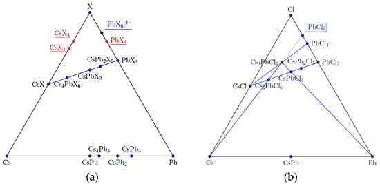 Perovskites are another example of the importance of the crystal-chemical hierarchical structure, for example, CsPbX3. In these, photoluminescence (PL) is associated with the octet [PbX6]4− and is preserved at high irradiation doses, as well as during the formation of mixed crystals. In this case, the equilibration of the multicomponent system is not required, and the replacement occurs with “bricks” or octets. Figure 5a shows a section that was most often obtained using the example of the Cs-Pb-X3 system [,,]. It is evident that a number of specific compounds are formed. According to the triangulation theory, if two quasi-binary sections intersect, then a compound is located at their intersection. Therefore, the study of cuts suggests that there must be cuts that pass through this point. In order to find this cut, it was proposed to add a crystal-chemical structure-forming element—the octet [PbX6]4− (Figure 5b)—as a configuration point. Then, if in the Cs-Pb-Cl system, the lines [PbCl6]–Cs and CsCl–PbCl4 are drawn, two points will appear at the intersections. According to the hypothesis proposed by the authors of this article, in this case there should be compounds at the intersection points.