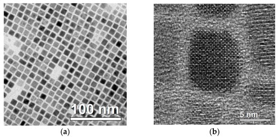 High-resolution transmission electron microscopy images of CsPbBr3 nanocrystal []. (a) TEM images with 100 nm resolution; (b) TEM images with 5 nm resolution.