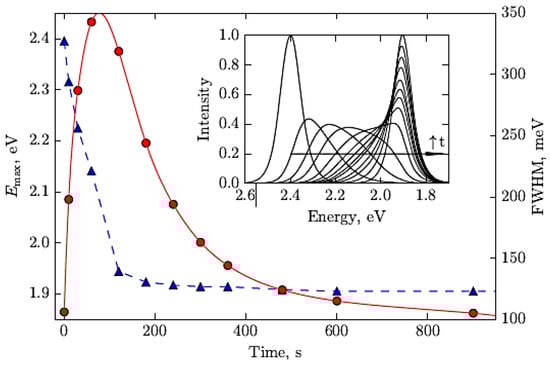 Dynamics of changes in photoluminescence spectra during the anionic substitution of Br–I: triangles represent the time dependence of the energy corresponding to the maximum PL intensity, and dots represent the time dependence of the half-width of the PL line [].