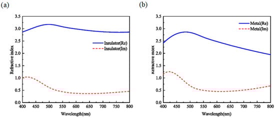 VO2 has been extensively studied since its discovery in 1959 [38]. The phase transition properties of VO2 have garnered significant interest among researchers [39], as illustrated by the refractive index curves before and after the phase transition depicted in Figure 1. VO2 remains in an insulating state below 68 °C (341 K); however, it undergoes a phase transition from insulator(I) to metal(M) when the temperature exceeds this critical threshold. This transition is accompanied by a significant decrease in the refractive index when VO2 enters its metallic state. Such optical properties offer opportunities for designing dynamic gamut color filters. Furthermore, the relatively low phase transition temperature of VO2 compared to other PCMs means that it requires fewer conditions for initiating the phase transition, thereby expanding its applicability in optical design.