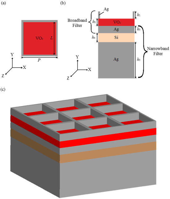The FROC device designed in this paper is illustrated in Figure 2. Figure 2a,b present the top view and front view of the device for a single period, respectively, and Figure 2c shows the schematic of the device configured for multiple periods to form an array. The device consists of an Ag mesh, a VO2 layer, an Ag layer, a silicon (Si) layer, and an Ag substrate layer arranged sequentially from top to bottom. The period P is set at 200 nm, length L is 180 nm, heights h1, h2, and h3 are all maintained at 40 nm, height h4 is specified as 50 nm, and substrate thickness h5 is 200 nm. The structure was simulated using FDTD Solutions with material data from Palik [40] and Rakić [41]. Mesh sizes (dx, dy, dz) were uniformly maintained at 3 nm throughout the simulation process. The device is illuminated by transverse magnetic (TM) light.