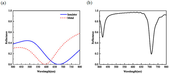 The FROC device may consist of a broadband filter and a narrowband filter. The reflection spectrum of the broadband filter and the narrowband filter are shown in Figure 3. The broadband filter consists of a meshed Ag layer, VO2 layer, and Ag layer, as depicted in the upper part of Figure 2b. This filter utilizes an SPR, which generates a broad valley in the spectrum, and causes a significant change with the phase transition of VO2 changes. As shown in Figure 3a, when VO2 is in its insulating state, the trough of the reflection spectrum is located at 673 nm, whereas after the VO2 phase transition, the trough of the spectrum is blue-shifted to 591 nm, and such a spectral change provides the basis for the dynamic color-rendering performance of the FROC device. Conversely, the narrowband filter consists of an Ag layer, Si layer, and Ag layer, as depicted in the bottom part of Figure 2b, which is a classical FP cavity resonance structure. By varying the thickness of the silicon layer, the thickness of the FP cavity can be varied and the reflection spectrum shifted. As shown in Figure 3b, the narrowband filter produces two distinct troughs, one located at approximately 418 nm with a trough reflectance value of around 51% and another at about 711 nm with a trough value near 19%.